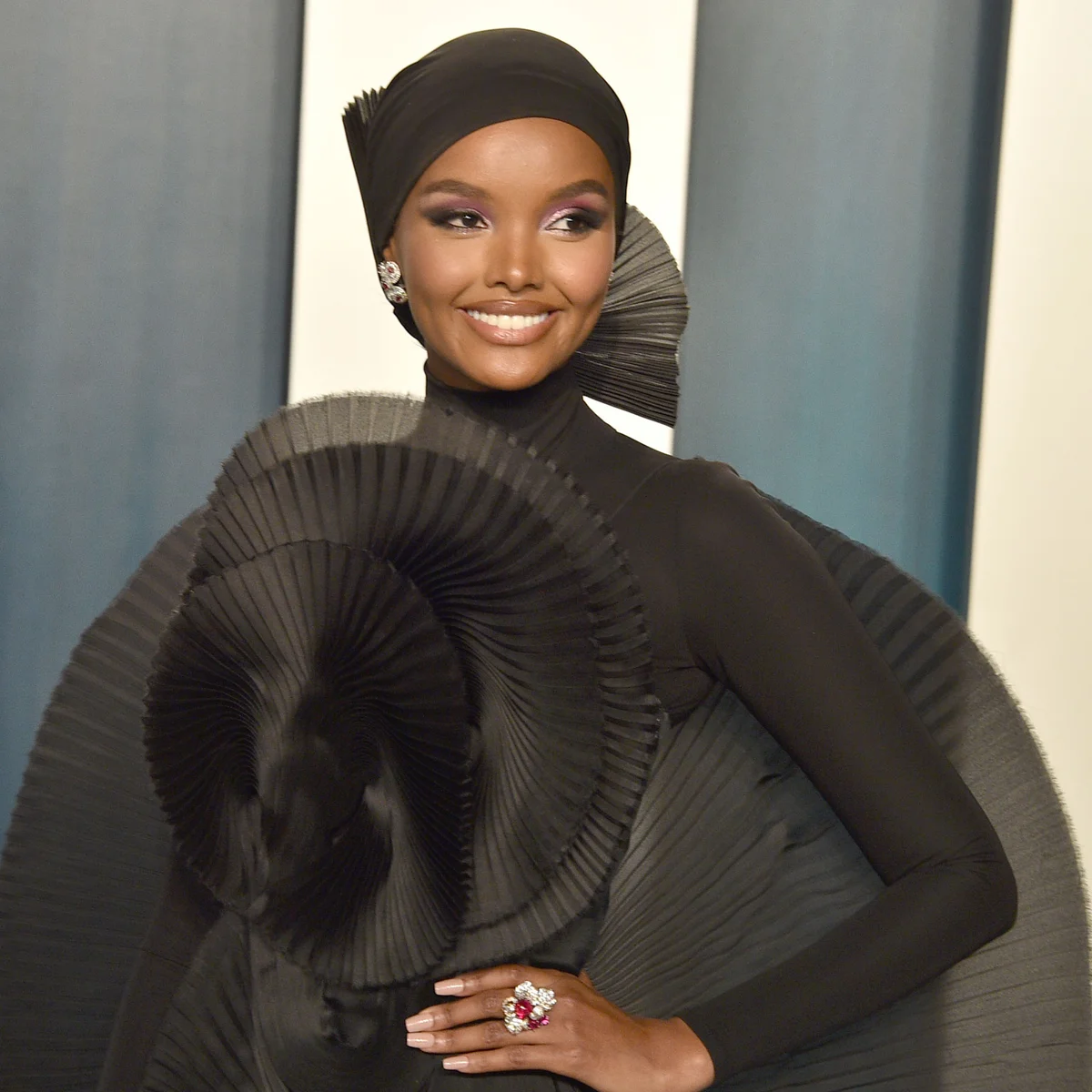 Model Halima Aden wearing a black pleated avant-garde gown and matching hijab at a red carpet event Halima Aden is widely recognized as the first hijab-wearing model to break into high-fashion runways and global campaigns.